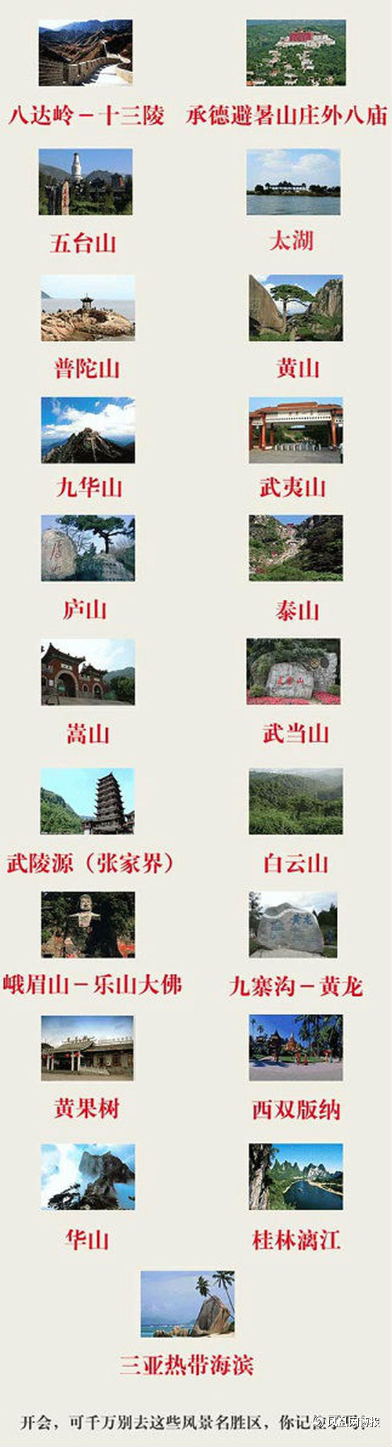 五一劳动节期间,一向风格极为稳重的中纪委监察部网站列出了21个配图景点,写着“这些地方风景虽好,开会可别去”。提醒各级党的机关、人大机关、行政机关、政协机关、审判机关、检察机关,以及工会、共青团、妇联等人民团体和参照公务员法管理的事业单位一律不得到这些风景名胜区召开会议。