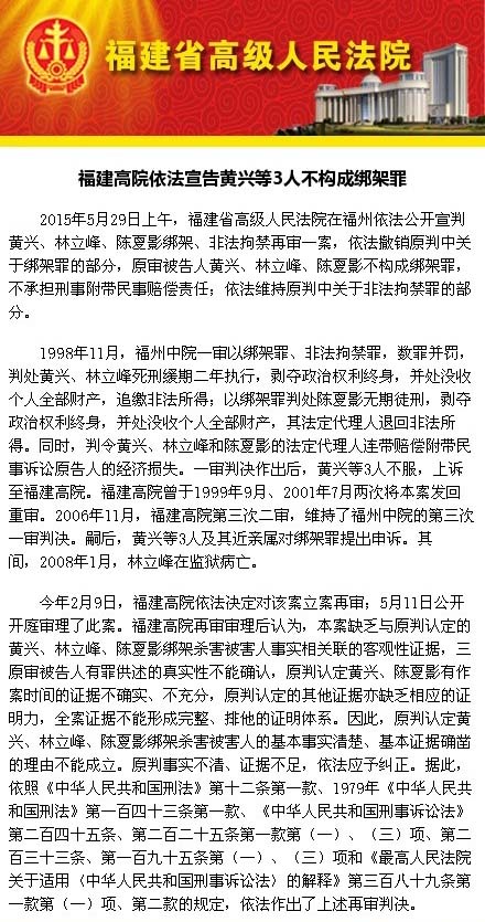 福建高院依法宣告黄兴等3人不构成绑架罪