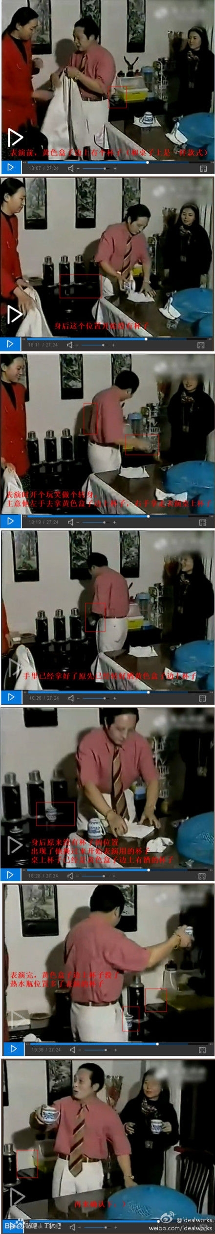 第一招:“隔空取蛇”。王林最为人所知的看家本领就是“隔空取蛇”,司马南说,这就是魔术中最常使用的障眼法。第一,这种表演都是在他熟悉的场合;第二,周围充满了人;第三,通常都有地毯;第四,他变来变去永远是他们家乡那几种蛇。而他在表演的 时候,他不断的利用人们对蛇的恐惧,来吓唬那些人,他有足够的时间去作弊,他也有足够的助手埋伏在现场来完成协同作弊。所以活蛇接起来或者空盆变蛇都是一些魔术上最常见的障眼法。