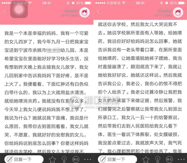 昨天,小苗妈妈通过手机APP发布网贴称,女儿16日晚上放学回家后告诉自己“下面好疼”。小苗妈妈查看后发现女儿私处红肿且沾有疑似白带的物质。