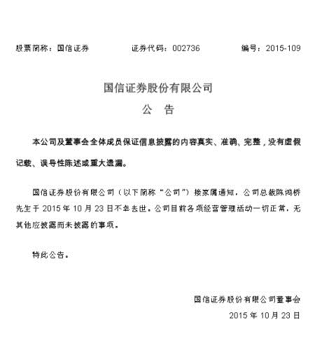 针对国信证券总裁陈鸿桥去世传闻,国信证券发布公告称,接家属通知,公司总裁陈鸿桥先生于2015年10月23日不幸去世。公司目前各项经营管理活动一切正常,无其他应披露而未披露的事项。
