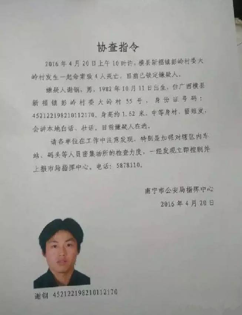 南宁市公安局指挥中心的协查指令称,横县新福镇彭岭村委大岭村发生的致4人死亡命案,已锁定嫌疑人。嫌疑人谢某,男,1982年10月11日出生,住大岭村55号。中等身材,留短发,会讲本地白话,壮话,目前在逃。